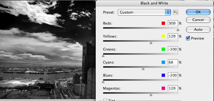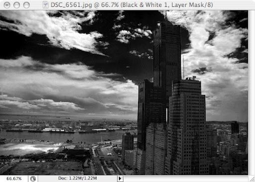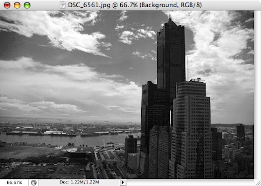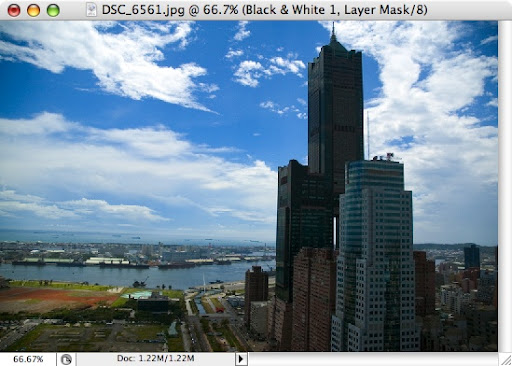 3.該影像我想強調出高雄港藍天白雲的感覺,所以首先將Blues色彩調到最暗,紅色針對左下方有一片瓦礫色的土壤以及85大樓下的一棟建築調亮,在把Greens調到最暗,增加局部影像的黑白對比,之後在微調各色彩間的皆調,以免過黑或過白。p.s此影像版權屬靈光∞串流所有。